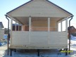На террасе при условии что она есть делаем перила из строганной доски со всех сторон, столбы террасные также строганные, а не обрезки профилированного бруса с шипом и пазом. Домкратики на столбах для дальнейшей регулировки. Балясины будут сделаны аккуратно. Обратите внимание что в дешёвых случаях это может быть и будет просто вагонка прибирая к неотесанной доске снаружи и столбы будут не квадратные а просто профилированный брус как на видео.