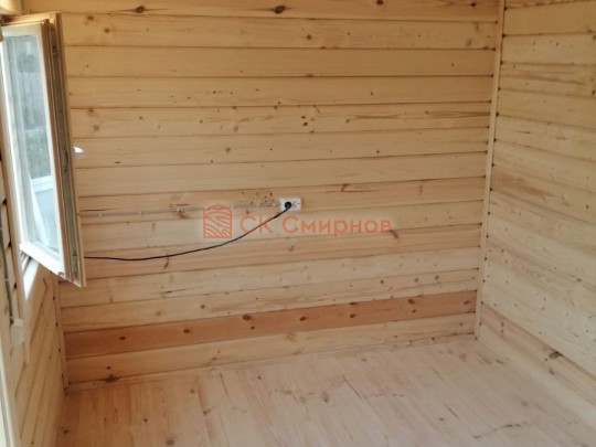 Из профилированного бруса естественной влажности 9х14см, 14х14 см или 14х19 см. Сборка сруба в теплый угол на нагеля или гвозди 200 мм со сверлением отверстия в верхнем брусе (в зависимости от вида бруса).