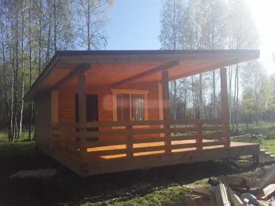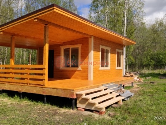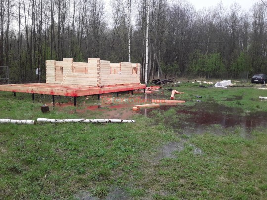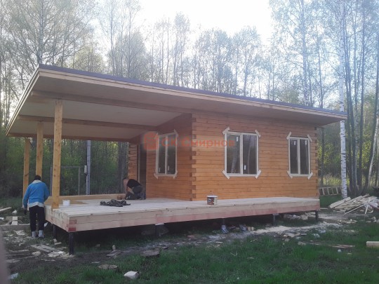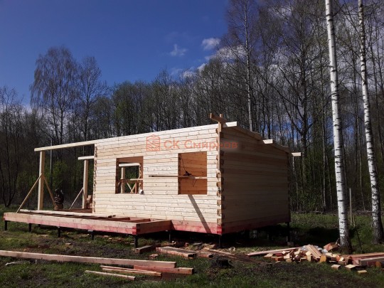 Из профилированного клееного бруса 9х14см, 14х14 см или 14х19 см. Сборка сруба в теплый угол на нагеля или гвозди 200 мм со сверлением отверстия в верхнем брусе (в зависимости от вида бруса).
