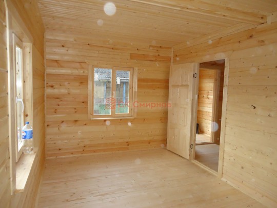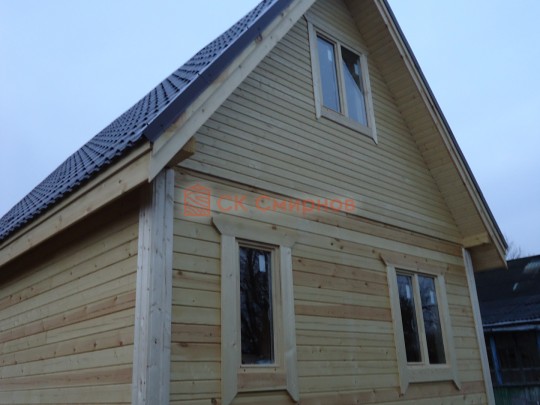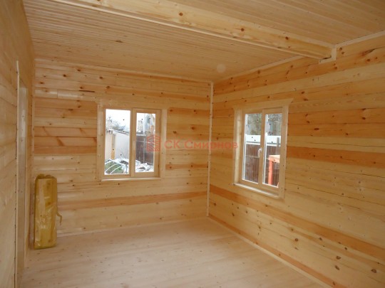 Из профилированного сухого бруса 9х14см, 14х14 см или 14х19 см. Сборка сруба в теплый угол на нагеля или гвозди 200 мм со сверлением отверстия в верхнем брусе (в зависимости от вида бруса).